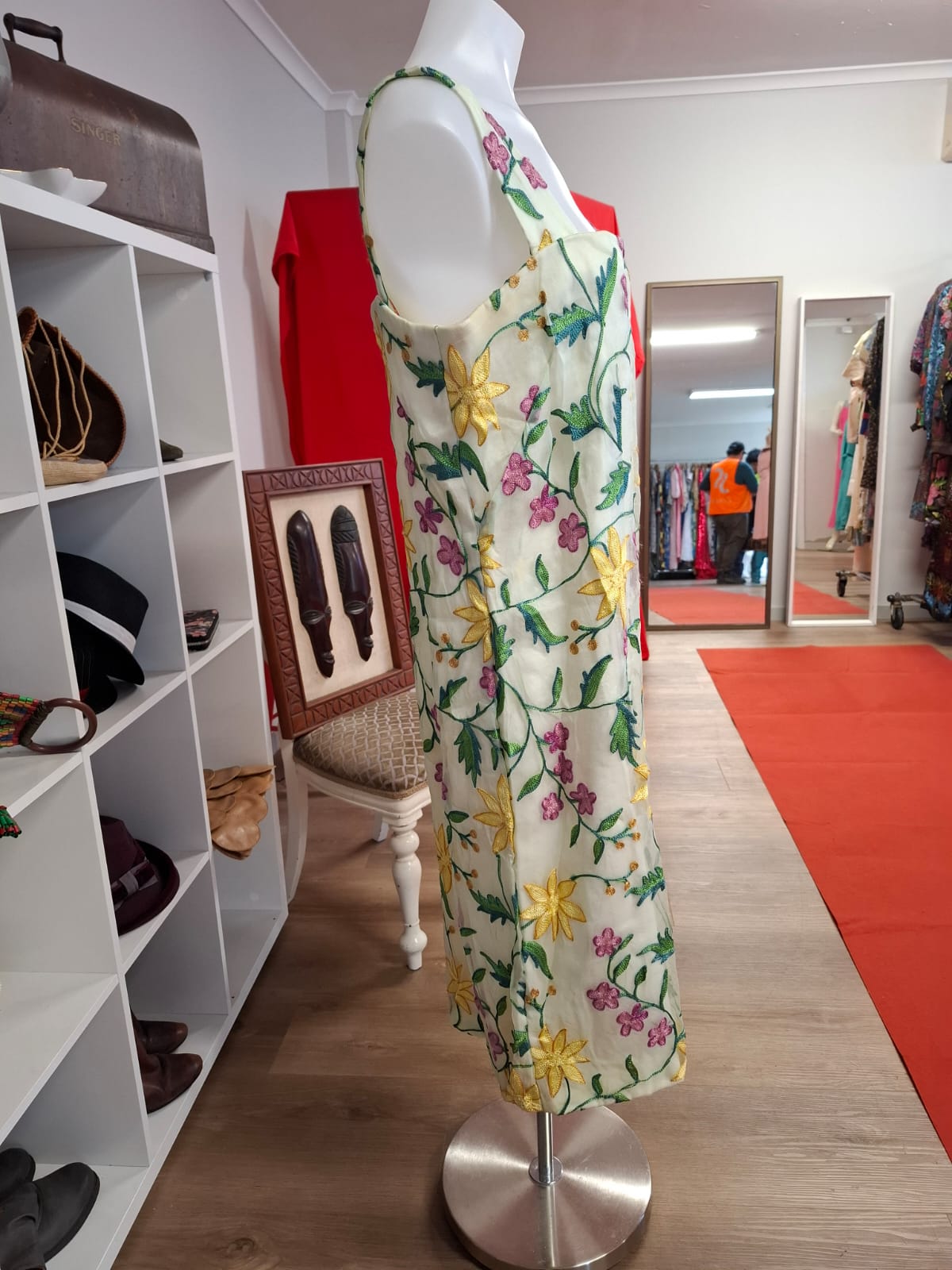 80's Meticulous Embroidery design. Square neck. Delicate fabrics like pineapple and abaca was used. Non-stretch. Zipper back. Mini dress. Sando strap.
